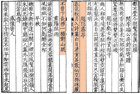 | 題隱霧亭 春花秋月入詩篇。 白日清宵是散仙。 空捲珠簾不曾下。 長移一榻對山眠。 Пишу на беседке «Сокрытое в тумане» Цветы весной, осенняя луна входят в строки моих стихов. Белым днем, ясной ночью я словно праздный святой. Свободно поднятый «полог жемчужный» так и не был опущен. Навсегда унесла я свою постель, чтобы спать среди гор. Стих достаточно подробно рассмотрен в начале темы. Добавлю лишь, что написан он 861 г. во время путешествия Юй на восток страны. А так этот стих выглядит в старом ксилографе 唐女郎鱼玄机诗集 (выделен розовым, старые книжки читались слева направо и сверху вниз).